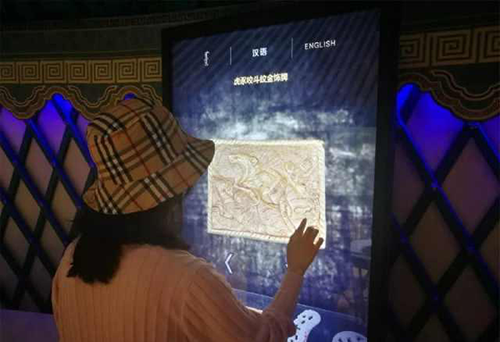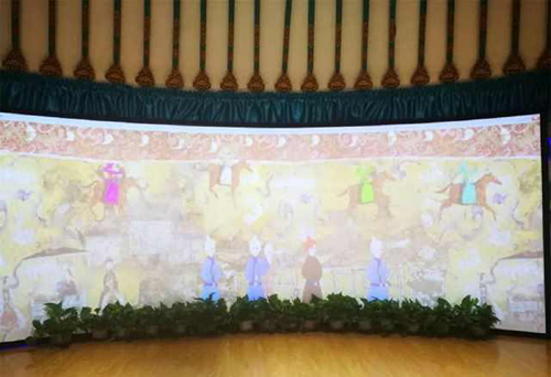 基于米蘭壕壁畫里的侍女騎射圖,運用互動多通道弧形投影融合和數(shù)字化技術(shù)將騎馬射箭的蒙古女性角色活化。運用模塊掃描、觸感互動的技術(shù),使游客自己創(chuàng)意上色的作品在“壁畫”里動起來,新奇感陡增,進一步增強了人機互動,實現(xiàn)了個性化的交流體驗。