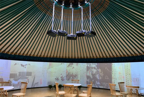 此次項目采用了5臺6000流明ROLY樂麗激光工程投影機,弧形融合,融合帶為單臺投影機畫面的19%,弧形融合顯示中,增加了互動體感系統(tǒng),讓參觀者可以使用互動系統(tǒng)掃描作品,推送到投影融合中顯示,可以進行人畫互動,大大增加了觀眾的體驗感。