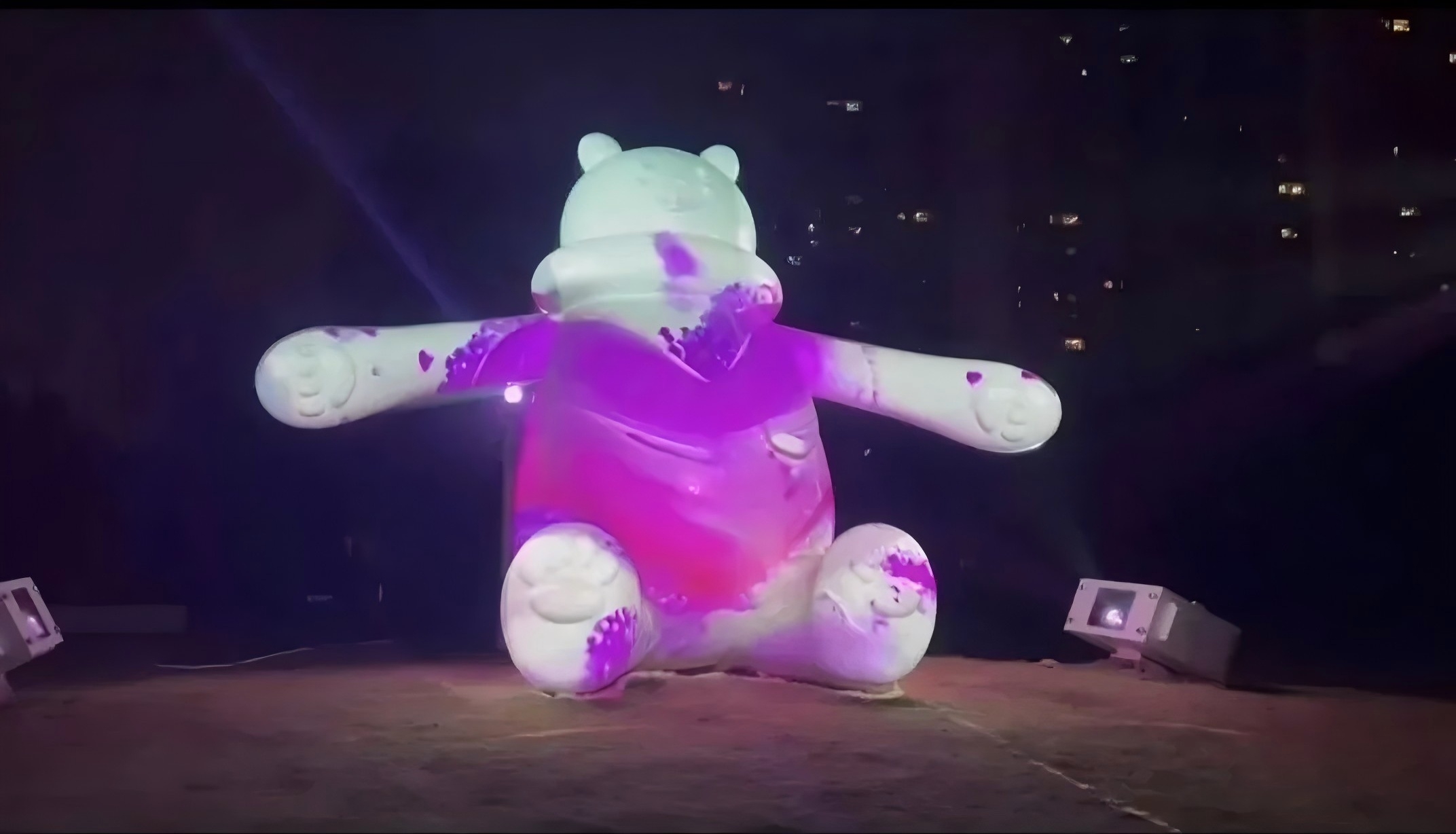 在銀杏公園那片開(kāi)闊的場(chǎng)地中央,靜立著一只約有 5 米高的小熊。它那憨態(tài)可掬的模樣仿若從童話(huà)世界走來(lái),圓潤(rùn)的耳朵俏皮地豎著,仿佛在傾聽(tīng)著周?chē)膭?dòng)靜。采用6臺(tái)RL-K1激光投影機(jī)協(xié)同作業(yè),通過(guò)先進(jìn)的融合拼接技術(shù),精準(zhǔn)地將絢麗多彩的畫(huà)面投射于大型物體之上,使其表面瞬間被奇幻的光影所覆蓋,呈現(xiàn)出美輪美奐、氣勢(shì)磅礴的視覺(jué)效果。