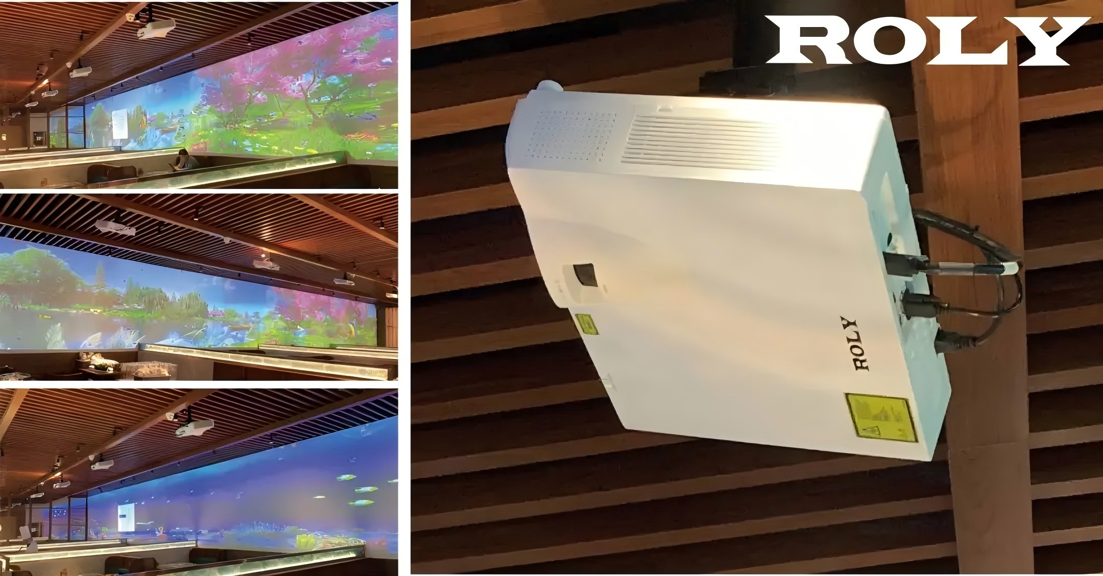 為了確保投影效果的清晰與震撼,ROLY采用了8臺(tái)激光短焦投影機(jī)的影像無(wú)縫拼接在一起,創(chuàng)造更寬廣的觀影畫面,每臺(tái)投影機(jī)都經(jīng)過(guò)精密調(diào)校,以確保畫面質(zhì)量與流暢性。 四季椰林場(chǎng)地布置得溫馨且有格調(diào),即使是滿座時(shí)刻,每一位顧客都能近距離感受到投影秀帶來(lái)的視覺(jué)震撼,在用餐的同時(shí)讓人仿佛身處異時(shí)空,時(shí)間和空間的交錯(cuò)感帶來(lái)極強(qiáng)烈的視覺(jué)體驗(yàn)。