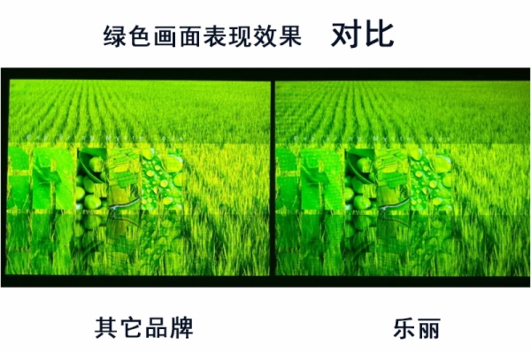 綠色:傳統(tǒng)的LCD與DLP實(shí)際效果,綠色部分偏淡黃,與原畫面略有出入。ROLY(樂(lè)爾麗)激光投影機(jī)色彩與原圖實(shí)際效果無(wú)差異,純色表現(xiàn)艷麗,色彩翠綠,畫質(zhì)亮麗清晰如畫。