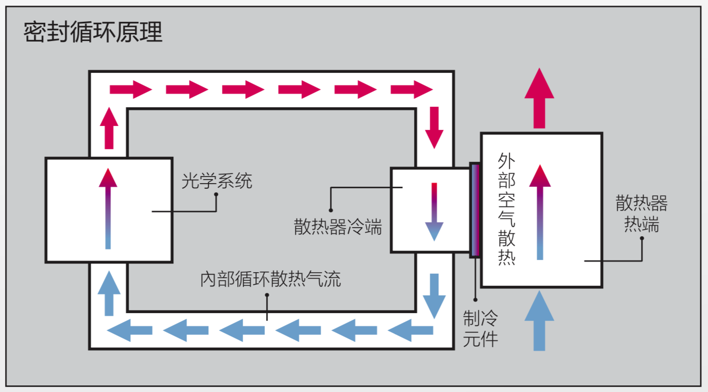 ICCS技術采用的是密閉散熱原理,此系統(tǒng)分為外部散熱系統(tǒng)和內(nèi)部循環(huán)散熱系統(tǒng),外部系統(tǒng)和內(nèi)部系統(tǒng)通過中間的制冷器產(chǎn)生勢能差,如下圖示,內(nèi)部循環(huán)散熱系統(tǒng),可以將內(nèi)部光學系統(tǒng)產(chǎn)生的熱量,循環(huán)流動到制冷器件,再通過制冷器件的勢能差,傳導到外部的散熱系統(tǒng),實現(xiàn)冷熱交換,由于內(nèi)部循環(huán)散熱系統(tǒng)完全與外界隔絕,可以確保內(nèi)部光學器件工作的良好恒溫環(huán)境,避免外界環(huán)境中灰塵等的影響,進而保證投影機性能穩(wěn)定,免去了后期維護操作的配件成本和人力成本,這些都是這項設計給最終用戶和加盟合作伙伴帶來最直接的好處。
