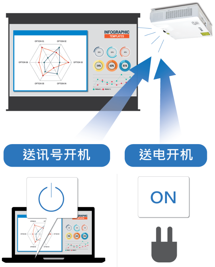 "送訊號(hào)開機(jī)"是指通過發(fā)送電腦訊號(hào)啟動(dòng)投影機(jī),適用于要遠(yuǎn)端控制或集中管理多個(gè)設(shè)備的場景,例如服務(wù)器機(jī)房或遠(yuǎn)程維護(hù)。"送電開機(jī)"是指通過供電來啟動(dòng)投影機(jī),當(dāng)插頭接通電源時(shí),投影機(jī)會(huì)開始進(jìn)行開機(jī)操作。本系列兩種皆具備,而選擇哪種開機(jī)方式取決于設(shè)備的類型、應(yīng)用場景和用戶需求。