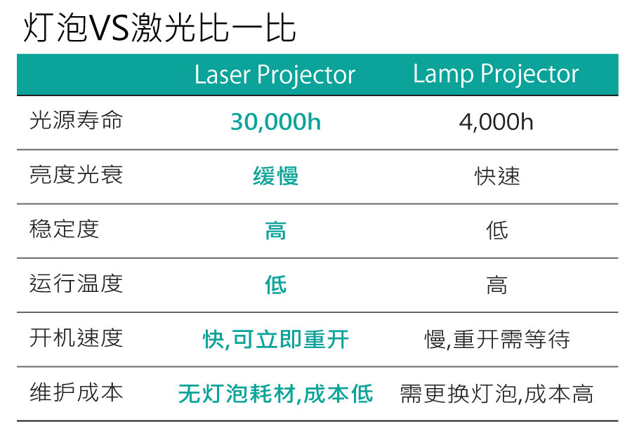 使用NICHIA全新光學(xué)極光二極管,提供長達(dá)30,000小時(shí)的免維護(hù)運(yùn)行時(shí)間。激光光源低衰減特性,使得輸出畫質(zhì)長期保持高亮度,色飽和度和對比度。