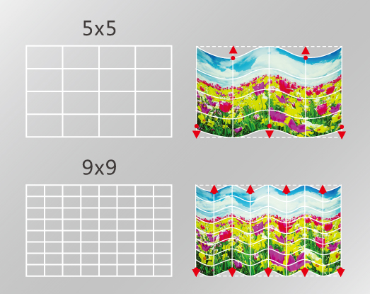 除了曲面校正外,還可以選擇5x5和9x9進(jìn)行多點(diǎn)校正,此功能可以讓您使用遙控器調(diào)整特殊屏幕如不規(guī)則或波形墻面,搭配特殊展覽展示進(jìn)行更多有趣的創(chuàng)意投影。