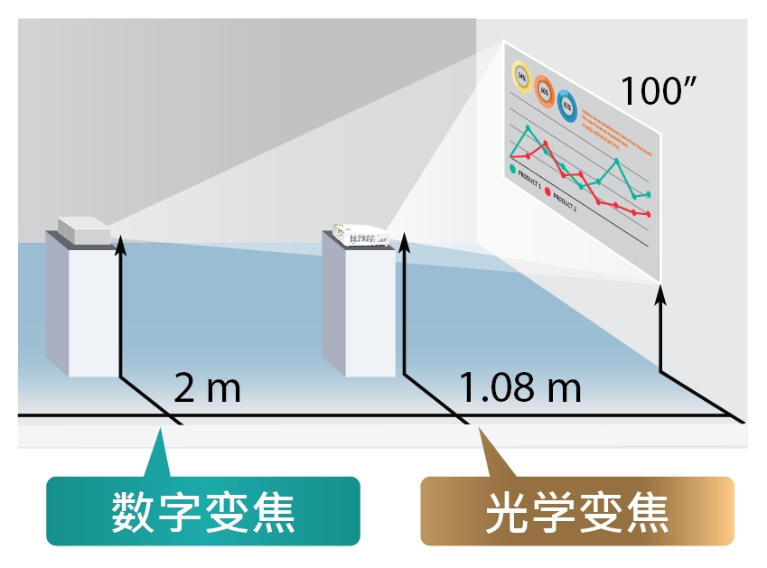 搭載的數(shù)字變焦功能,等比例縮小顯示畫面,使超出光學(xué)變焦范圍的畫面符合您的屏幕,減少了您需要重新安裝投影機(jī)支架的需求,節(jié)省時(shí)間、金錢和麻煩。
