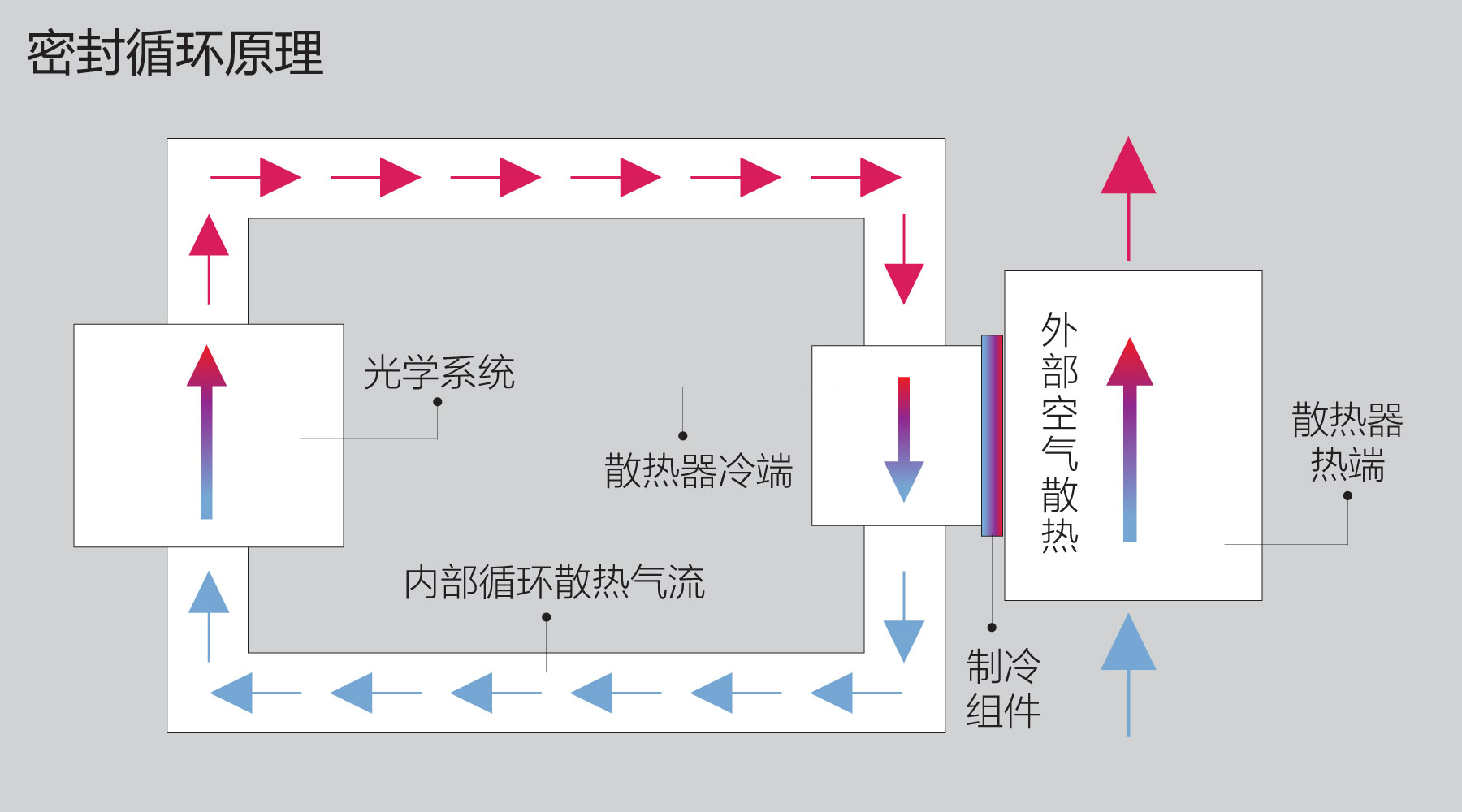 獨(dú)創(chuàng)內(nèi)部循環(huán)冷卻系統(tǒng) (Internal Circulating Cooling System) 采用密閉散熱原理,外部散熱系統(tǒng)和內(nèi)部回圈散熱系統(tǒng),確保內(nèi)部光學(xué)系統(tǒng)具有良好恒溫環(huán)境。