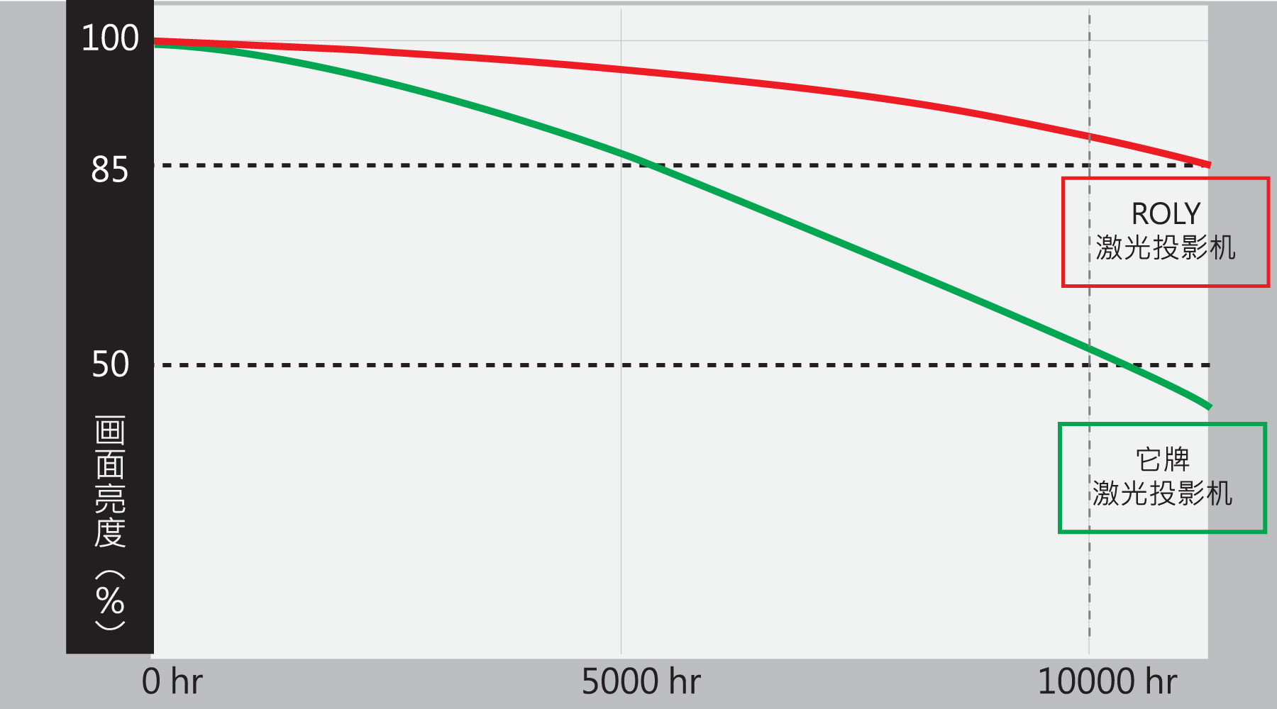 它牌不敢面對的畫面亮度衰減問題,ROLY品牌敢承諾,有效給予畫面亮度測試數(shù)據(jù)。使用一萬小時,他牌畫面亮度可能衰減50%,ROLY激光投影機(jī)保證畫面亮度衰減少于20%。